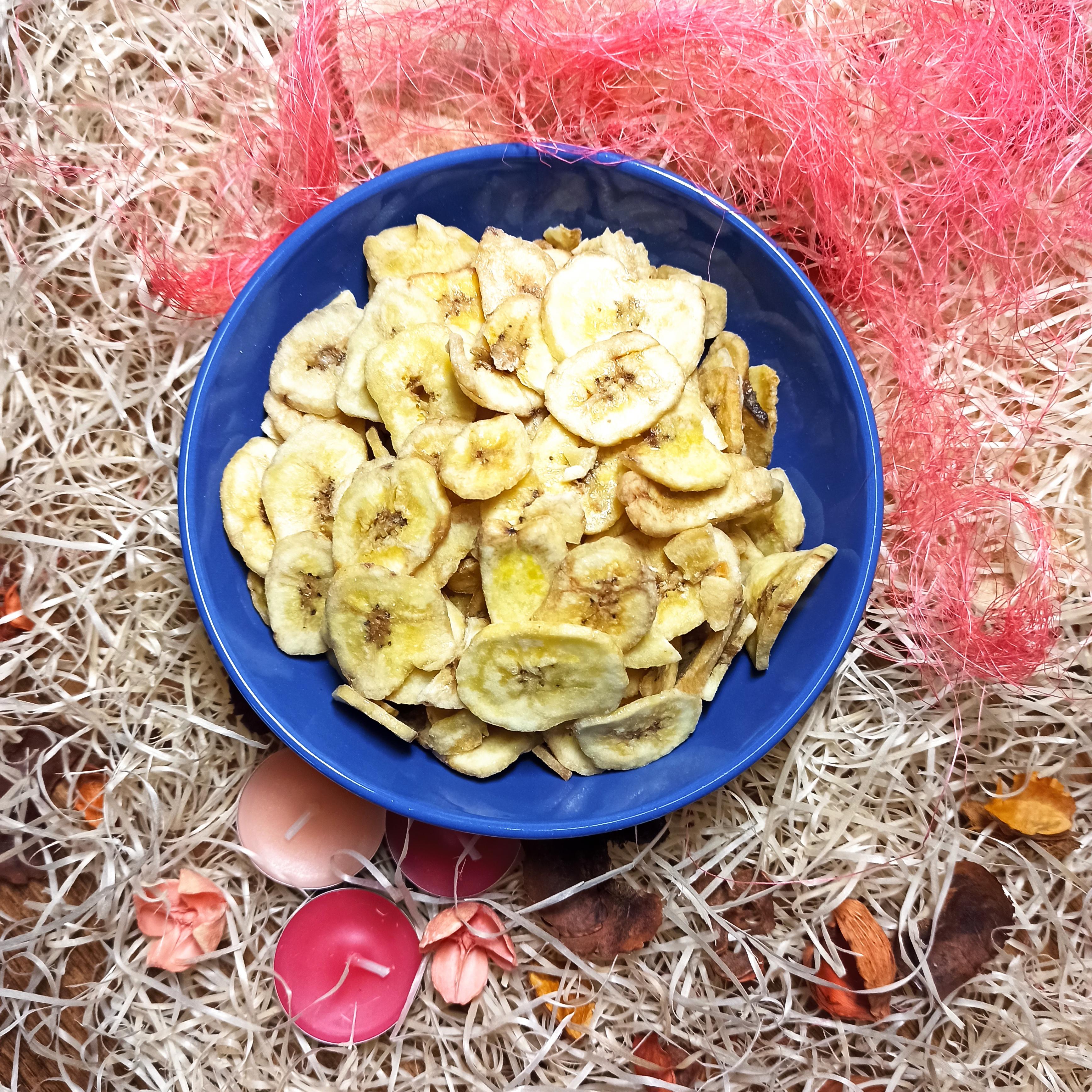 Banán chips obsahuje tři přírodní cukry – sacharózu, fruktózu a glukózu, doplněné vysokým obsahem vlákniny. Tak co víc si přát? Banán dodá okamžitou podpůrnou dávku energie, kterou často ocení nejen sportovci, ale každý z nás. Banán obsahuje proteiny, které si naše tělo umí přetvořit na serotonin, proto bychom po banánu měli sáhnout i ve chvíli, kdy nemáme zrovna nejlepší náladu. Nelze opomenout také důležité vitamíny skupiny A a B, které jsou v banánech bohatě zastoupeny.