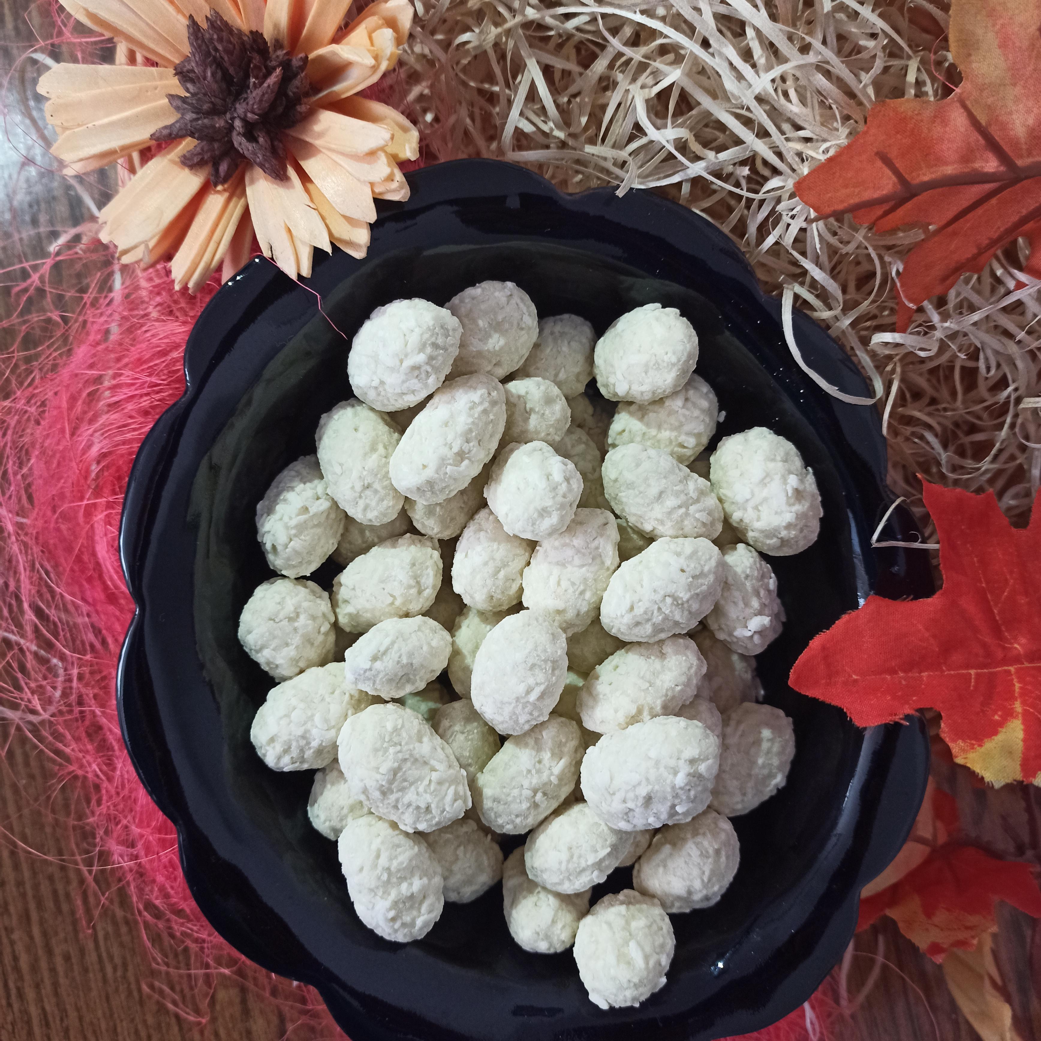 Mandle v polevě z kokosu a bílé čokolády by měly být zařazeny do vašich jídelníčků. V tomto počasí jsou nejlepším lékem proti únavě a depresím. V jádru se zakousnete do mandle bohaté na hořčík a vápník, prospěšným pro pevnost kostí, nehtů, vlasů a správnost srdeční činnosti. Jemná poleva z bílé čokolády založená na kakaovém másle, mléce a cukru je společně se sypaným kokosem nedílnou součástí této pochutiny vhodné nejen k Vánočním tabulím a jiným příležitostem. Tato kombinace tří složek v podobě kuliček raffaello svou chutí učaruje každého.